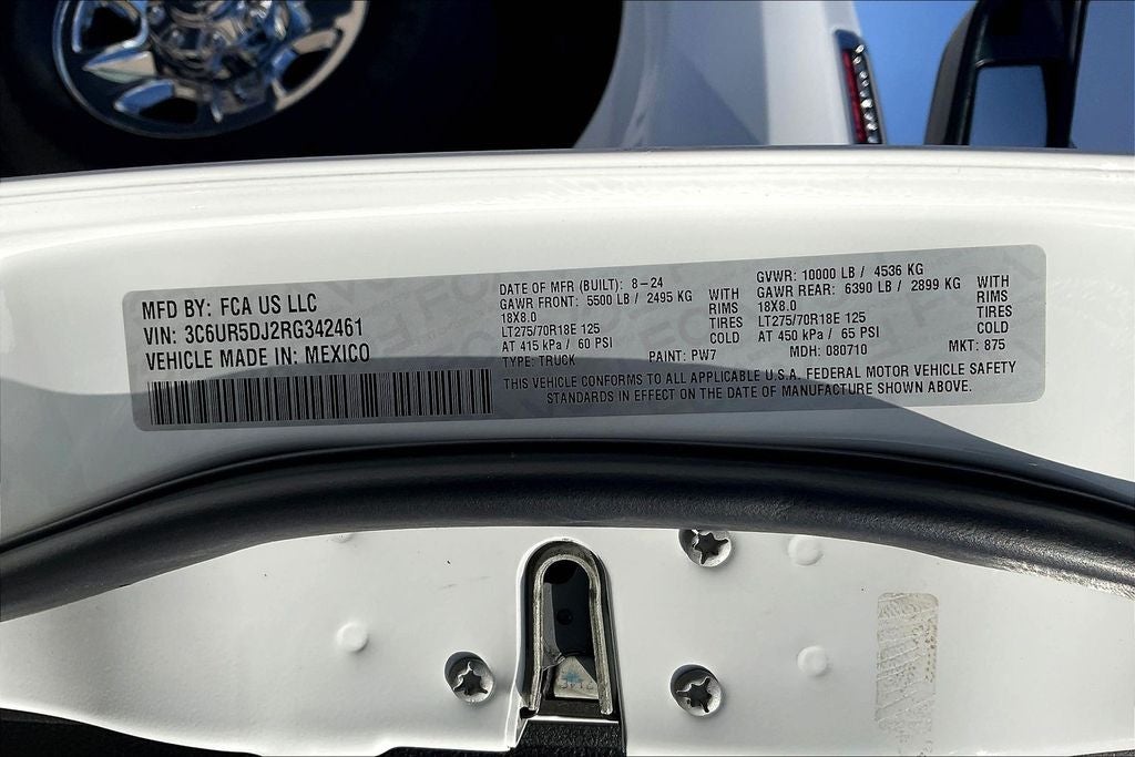 2024 Ram 2500 Big Horn Big Horn Bright White Clearcoat 4D Crew Cab 4WD 6.4L V8 8-Speed Automatic 1 Owner, 2500 Big Horn, 4D Crew Cab, 6.4L V8, 8-Speed Automatic, 4WD, Bright White Clearcoat, Diesel Gray/Black Cloth, 2 Way Rear Headrest Seat, 3.73 Axle Ratio, 4 Way Front Headrests, 4-Wheel Disc Brakes, 40/20/40 Split Bench Seat, 6 Speakers, ABS brakes, Active Noise Control System, Air Conditioning, Anti-Spin Differential Rear Axle, Bed Utility Group, Black Exterior Mirrors, Bluetooth® Handsfree Phone & Audio, Brake assist, Bumpers: chrome, Center Hub, Center Stack Storage Drawer, Chrome Flat Cab-Length Side Steps, Cloth 40/20/40 Bench Seat, Compass, Connectivity - US/Canada, Delay-off headlights, Driver door bin, Dual front impact airbags, Dual front side impact airbags, Electronic Stability Control, Electronically Controlled Throttle, Emergency communication system: SiriusXM Guardian, Exterior Mirrors w/Heating Element, Front anti-roll bar, Front Armrest w/Cupholders, Front Center Armrest w/Storage, Front Fog Lamps, Front License Plate Bracket, Front reading lights, Fully automatic headlights, Global Telematics Box Module (TBM), GPS Antenna Input, Heated door mirrors, Illuminated entry, Integrated Center Stack Radio, Integrated Voice Command w/Bluetooth®, LED Bed Lighting, Low tire pressure warning, Manual Adjust 4-Way Driver Seat, Manual Adjust 4-Way Front Passenger Seat, Manufacturer's Statement of Origin, MOPAR Deployable Bed Step, MOPAR Spray In Bedliner, Occupant sensing airbag, Outside temperature display, Overhead airbag, Overhead console, Panic alarm, ParkView Rear Back-Up Camera, Passenger door bin, Passenger vanity mirror, Power 2-Way Driver Lumbar Adjust, Power Adjust Mirrors, Power door mirrors, Power steering, Power windows, Protection Group, Quick Order Package 2GZ Big Horn, Radio data system, Radio: Uconnect 3 w/5 Display, Radio: Uconnect 5 W w/8.4 Display, Rear anti-roll bar, Rear Folding Seat, Rear seat center armrest, Rear step bumper, Remote keyless entry, Remote USB Port - Charge Only, SiriusXM Radio Service, Speed control, Storage Tray, Tachometer, Tilt steering wheel, Tip Start, Tow Hooks, Traction control, Trip computer, Turn signal indicator mirrors, Variably intermittent wipers, Voltmeter, Wheels: 18 x 8.0 Steel Chrome Clad.