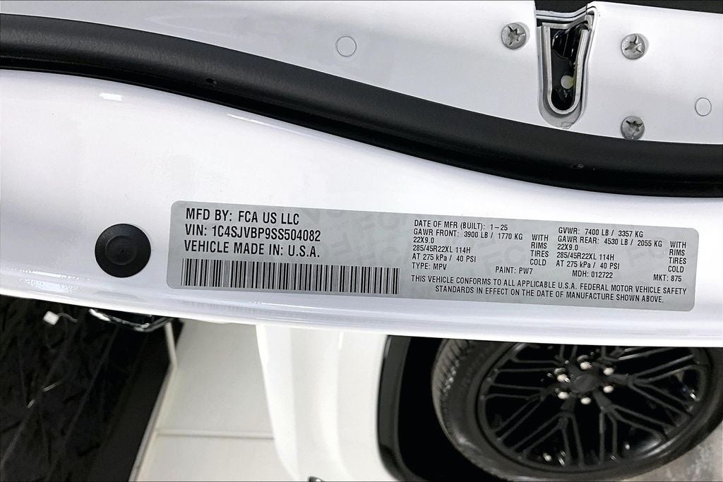 2025 Jeep Wagoneer Series II Series II Bright White Clearcoat 4D Sport Utility 4WD 3.0L I6 8-Speed Automatic Wagoneer Series II, 4D Sport Utility, 3.0L I6, 8-Speed Automatic, 4WD, Bright White Clearcoat, Black Leather, 3 Panel Sunroof, Adjustable Roof Rail Crossbars, All-Season Floor Mats, Alloy wheels, Apple CarPlay/Android Auto, Black Exterior Accents, Brake assist, Carbide Appearance Package, Cargo Cover, Cargo Tray, Compass, MOPAR Interior Protection Package, Navigation System, ParkView Rear Back-Up Camera, Power driver seat, Power Liftgate, Power steering, Power windows, Premium Group I, Quick Order Package 25F Carbide, Remote keyless entry, Reversible Carpet/Vinyl Cargo Mat, Wheels: 20 x 9 Gloss Black Painted Aluminum.